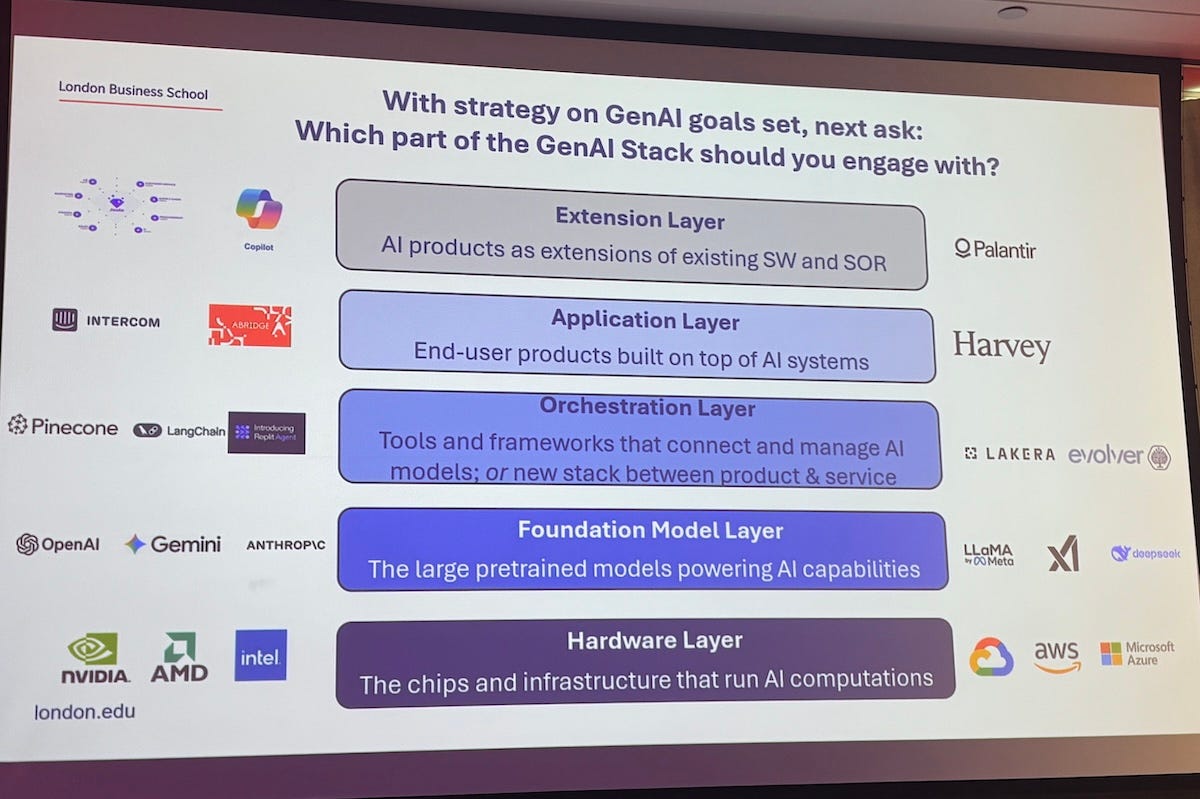 Companies must decide where in the AI stack they want to play, whether at the hardware, foundation model, application or orchestration layer. The biggest opportunities may lie in combining generative AI with traditional machine learning and enterprise data to produce a clearer value proposition.