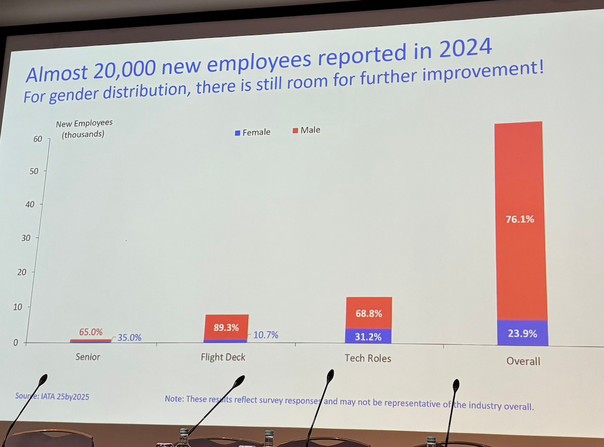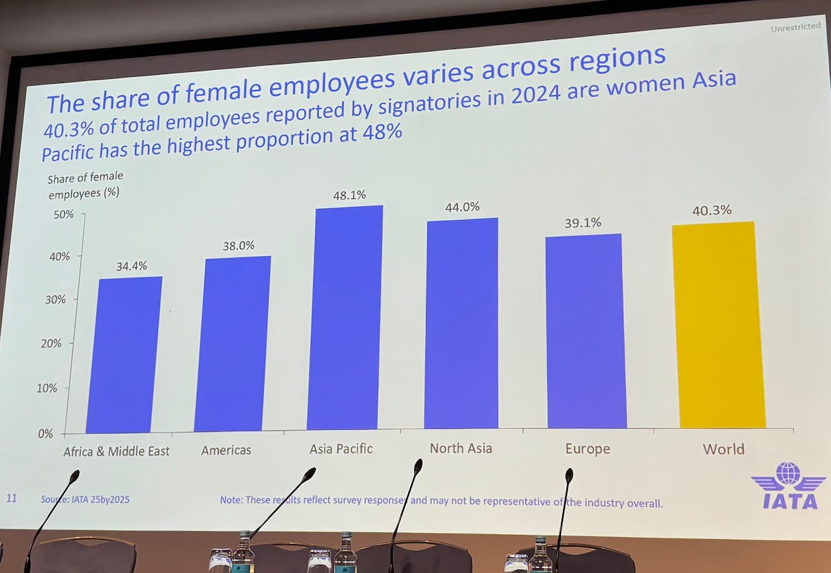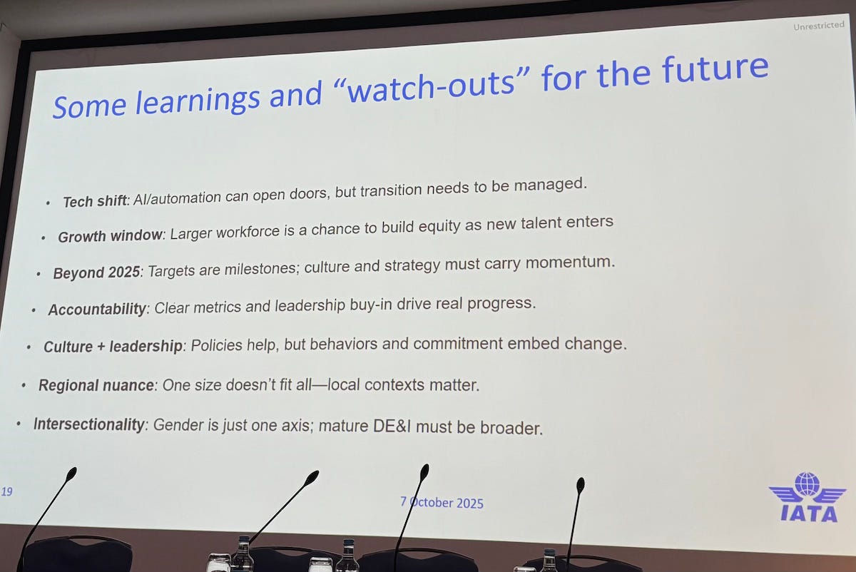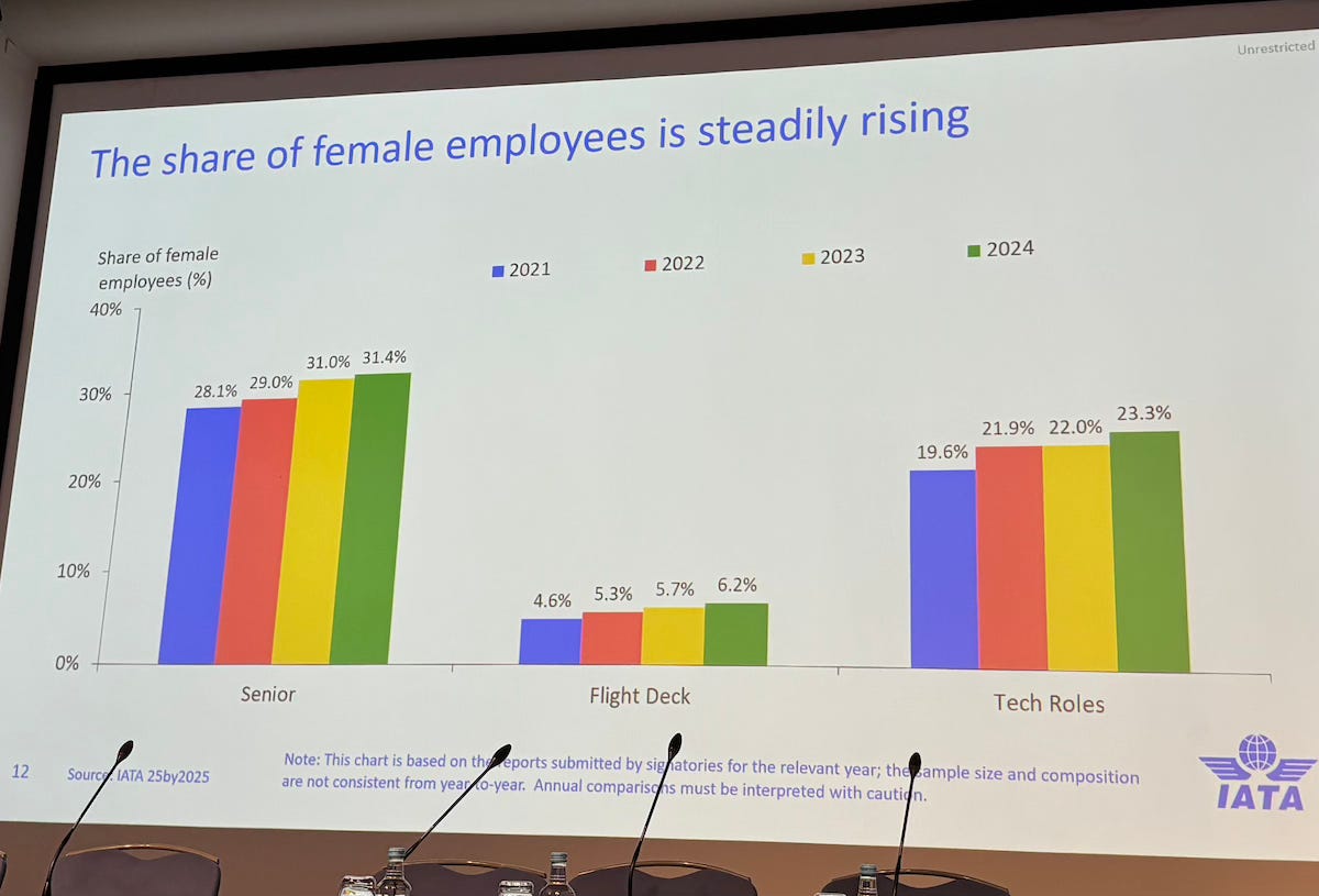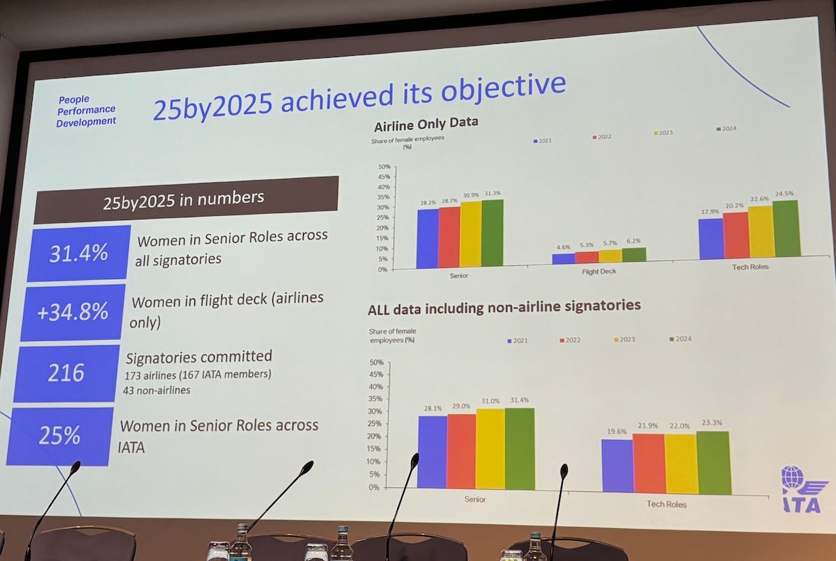 25by2025 is producing visible change. The number of women on the flight deck has increased by more than a third since 2021, reaching 6%, while women in senior roles now comprise 31%. Within IATA, one in four senior leaders is a woman.